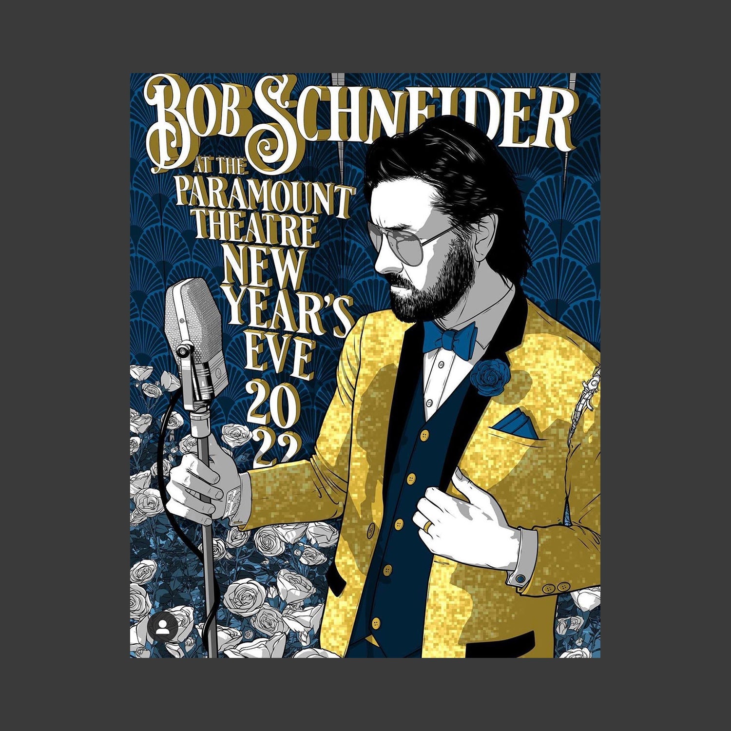 Official poster for Bob's 12.31.2021 full band New Year's Eve show at the Paramount Theatre in Austin, Texas. This is a silkscreen print of a Justin Barker (http://www.justinbarkerart.com/) design. 18" x 24". Signed by Bob. Shipped rolled in a poster tube.