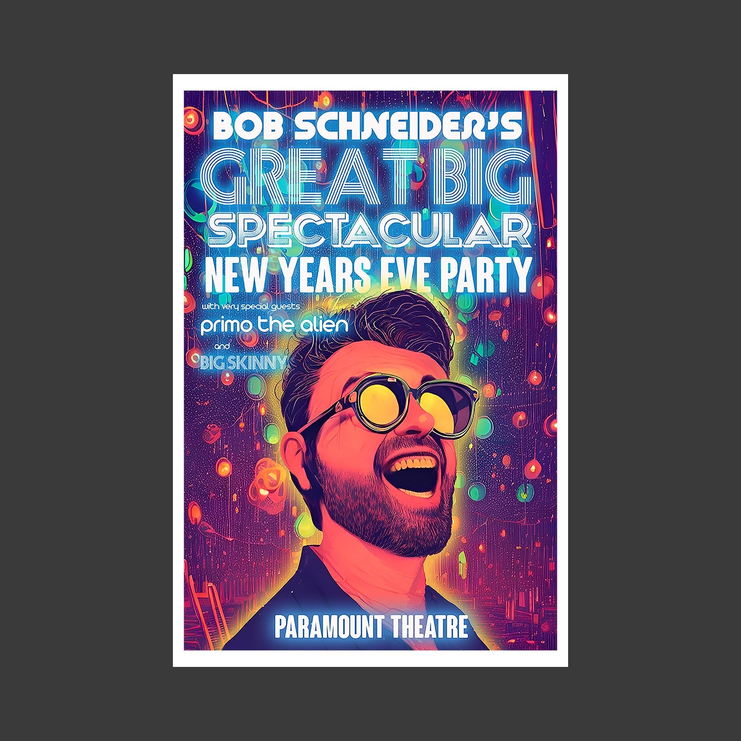Official poster for Bob's 12.31.2022 New Year's Eve show at Paramount Theatre in Austin, Texas. This is a digital print of a Bob Schneider design. 18" x 12". Signed by Bob. Shipped rolled in a poster tube.