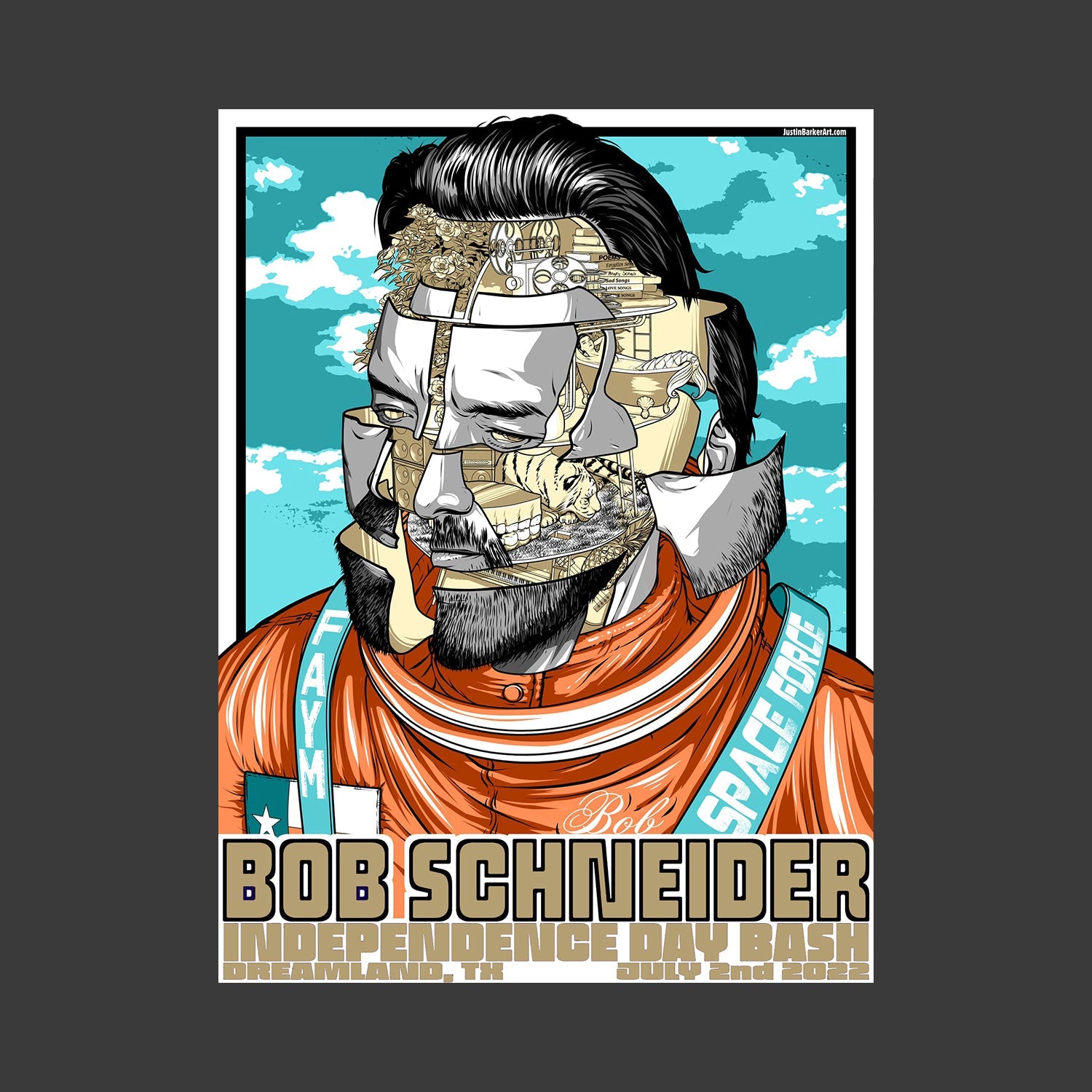Official poster for Bob's July 2, 2022 full band Independence Day Bash show at Dreamland in Dripping Springs, Texas. This is a silkscreen print of a Justin Barker (http://www.justinbarkerart.com/) design. 18" x 24". Signed by Bob. Shipped rolled in a poster tube.
