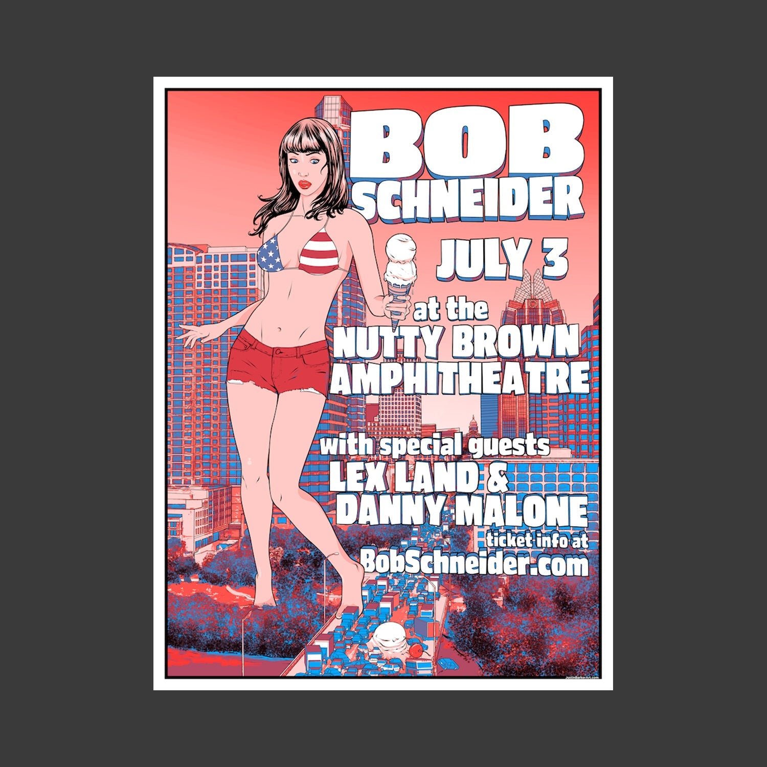Official poster for Bob's July 3, 2021 full band Independence Bash show at Nutty Brown Amphitheatre in Austin, Texas. This is a silkscreen print of a Justin Barker (http://www.justinbarkerart.com/) design. 18" x 24". Signed by Bob. Shipped rolled in a poster tube.