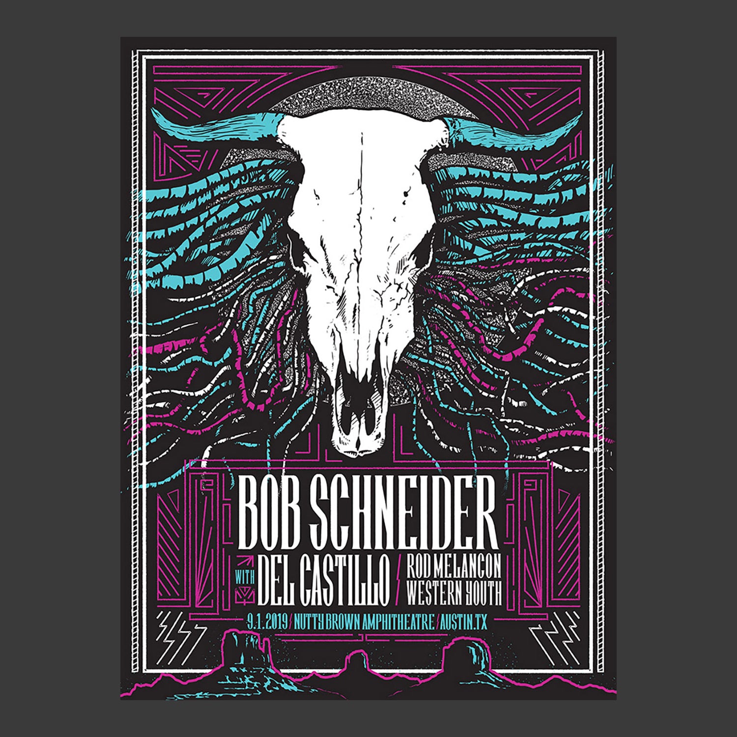 Official poster for Bob's September 1, 2019 full band Labor Day Celebration show at Nutty Brown Amphitheatre in Austin, Texas. This is a silkscreen print of a Brad Bond design. 18" x 24". Shipped rolled in a poster tube.