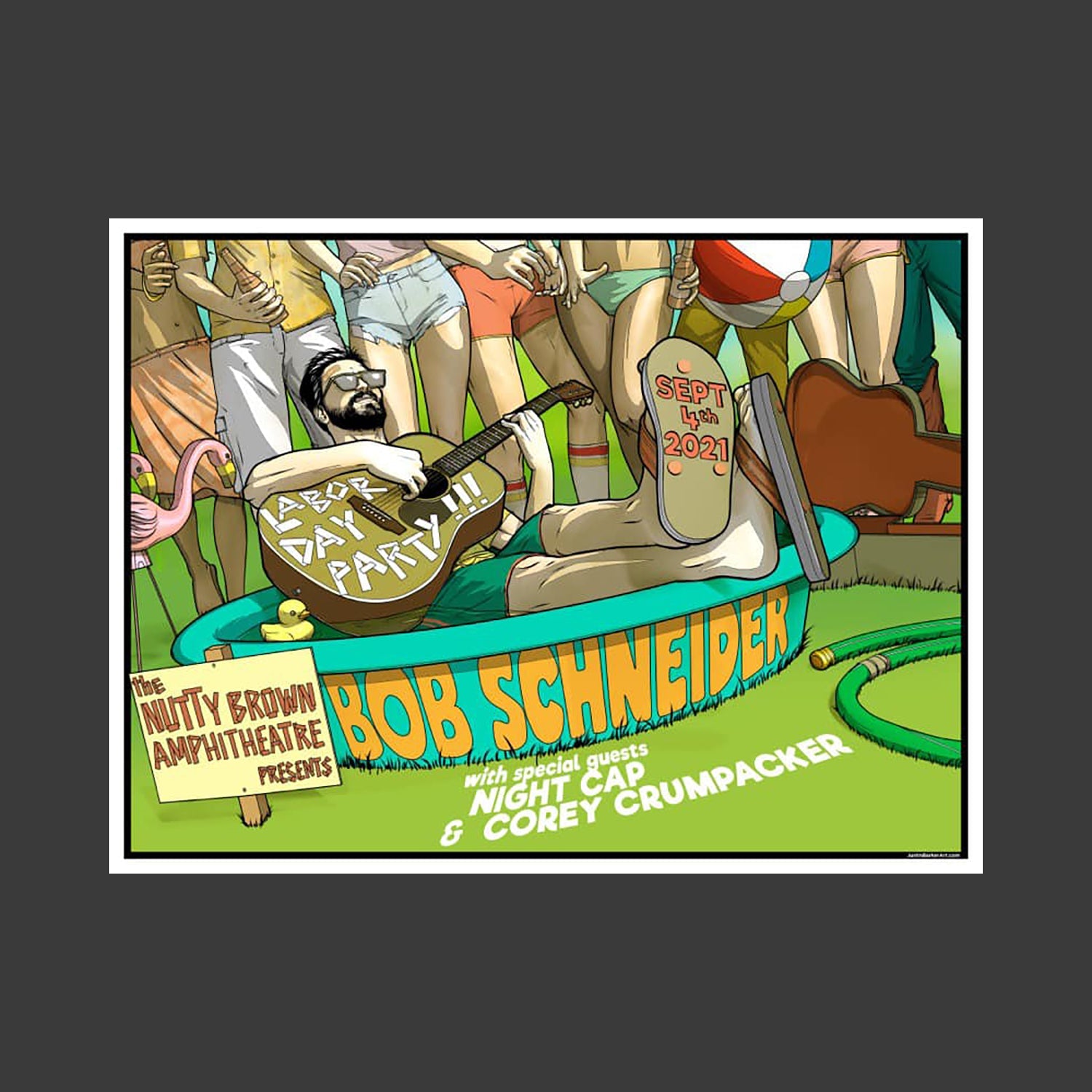 Official poster for Bob's September 4, 2021 full band Labor of Love Party at Nutty Brown Amphitheatre in Austin, Texas. This is a silkscreen print of a Justin Barker (http://www.justinbarkerart.com/) design. 18" x 24". Signed by Bob. Shipped rolled in a poster tube.
